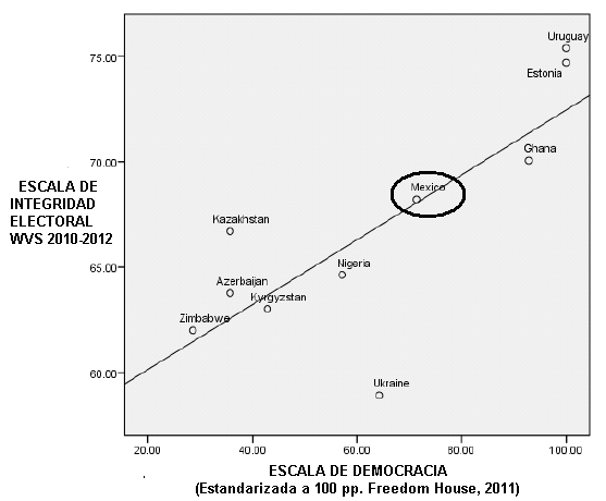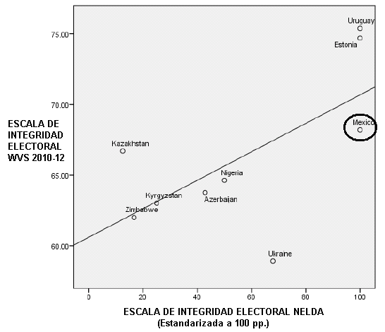 Así, según los datos comparados de la Encuesta Mundial de Valores, 2010-2012, (World Values Survey, 6ª ol.), los ciudadanos mostraban su confianza en la integridad electoral de sus procedimientos democráticos en Uruguay, Estonia y Ghana y, sólo en una ligera menor medida, en México, mientras que la confianza era considerablemente más reducida en regímenes híbridos como Ucrania, Kirguizistán o Zimbabue, medidos en índices que representaban el grado de mala práctica electoral. Estos datos eran similares a la percepción de la integridad electoral medida por expertos a través de la escala Freedom House o la escala Nelda, como se recoge en el siguiente gráfico.
